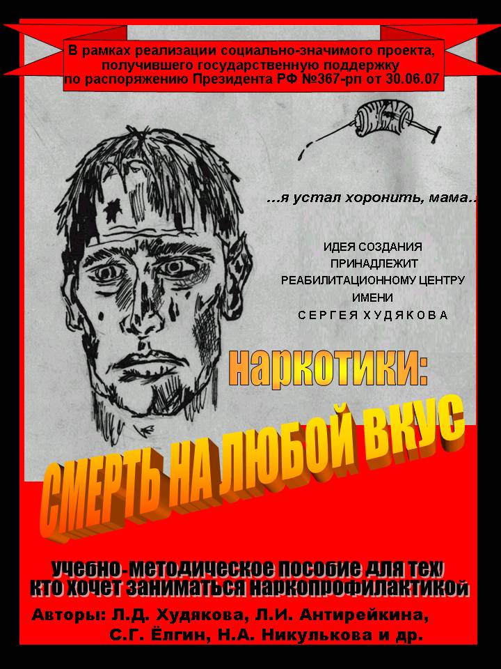 Это учебно-методическое пособие, написанное нами в рамках реализации проекта, выигравшего ПРЕЗИДЕНТСКИЙ грант, изначально получило название «СМЕРТЬ НА ЛЮБОЙ ВКУС (учебно-методическое пособие для тех, кто собирается заниматься наркопрофилактикой)». В последствии название было изменено на «НАРКОТИКИ: СМЕРТЬ НА ЛЮБОЙ ВКУС» Его обложка выглядит следующим образом: