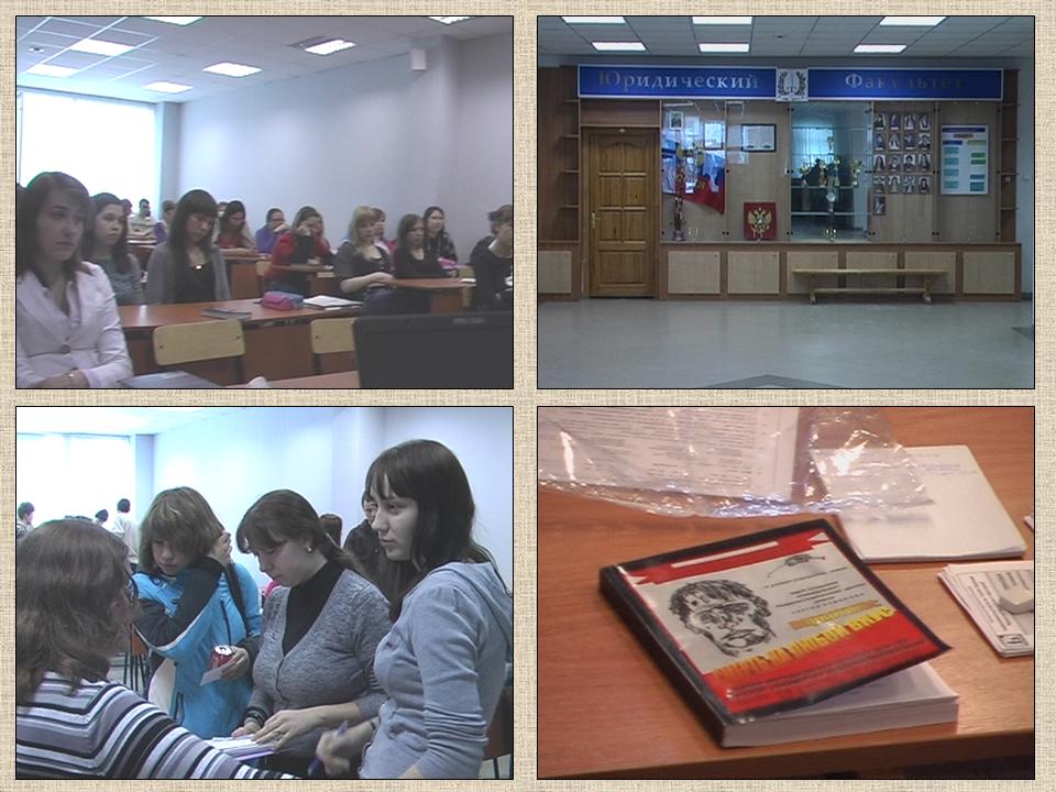 01 апреля 2010 г. По предварительной договоренности, которая была достигнута путем телефонных переговоров со специалистом по учебно-методической работе учебно-методического отдела Павловым Александром Алексеевичем после написания официального письма на имя Декана юридического факультета НГУ, доктора юридических наук, профессора Курчеева Валерия Сергеевича, состоялась информационная встреча со студентами 2-го курса юридического факультета НГУ. На встрече присутствовало около 40 человек. Встреча сопровождалась видео-показом фильма-визитки о деятельности нашей организации и мультимедийной демонстрацией результатов мониторинга наркоситуации в г. Новосибирске. Во встрече помимо Худяковой Людмилы Дмитриевны - директора нашей организации - принимал участие Феофилактов Юрий в качестве ответственного лица работу цифрового оборудования и за видеосъемку. Студенты были кратко ознакомлены с содержанием проекта - победителя Президентского гранта 2009 года и с условиями участия в его реализации.